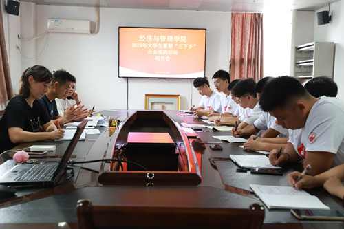 新闻网讯(通讯员李怡)2019年7月5日下午,经济与管理学院在小球馆三楼会议室召开了2019暑期“三下乡”社会实践活动动员会。经济与管理学院党委副书记兼副院长孙鹏飞、团委书记张培、团委副书记李怡以及社会实践队队员参加了此次会议,会议由张培主持。