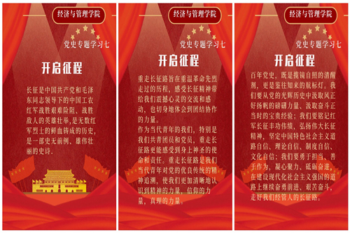 新闻网讯(通讯员王佳)2021年是中国共产党建党100周年,为进一步贯彻党史学习教育,引导师生坚定理想信念,传承红色基因,经济与管理学院开展了“重走长征路•开启征程”党史教育接力活动。此次系列活动由主题升旗仪式、“学党史讲党史,悟初心谱新篇”主题演讲比赛 、党史学习教育三部分组成。