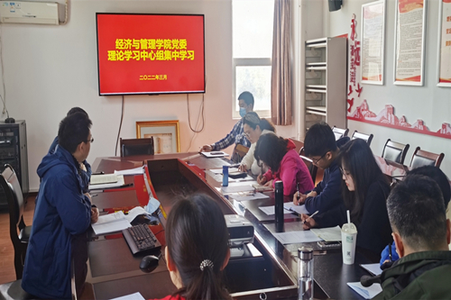 2022年3月28日下午,经济与管理学院党委理论学习中心组在小球馆三楼会议室开展第1次集中学习,学院领导班子、各教研室书记、各年级辅导员参加学习。会议由学院党委书记吴鲲主持。