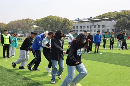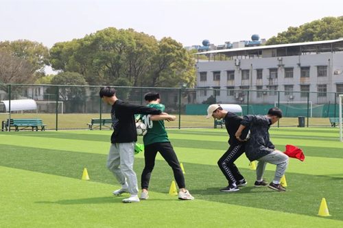 伴随着全场热烈的掌声,趣味足球赛开球。各年级老师与同学分为三组,参加三个环节的比拼。第一环节为贪吃蛇,老师同学们手拉手来回绕过障碍物,乐在其中,绿茵场上充满了欢声笑语,最后19级稳定发挥赢得了比赛。第二环节为九宫格,同学们背靠背将球夹在中间,既要防止球掉落,又得快速进入九宫格完成连线。比赛中的同学们都鼓足了劲,最终20级一马当先,赢得了比赛。第三环节为抢运物资,所有同学抢夺场中的足球,既需要进攻同时也要防守,同学们都积极参与,拼尽全力,21级凭借默契配合,赢得比赛胜利。