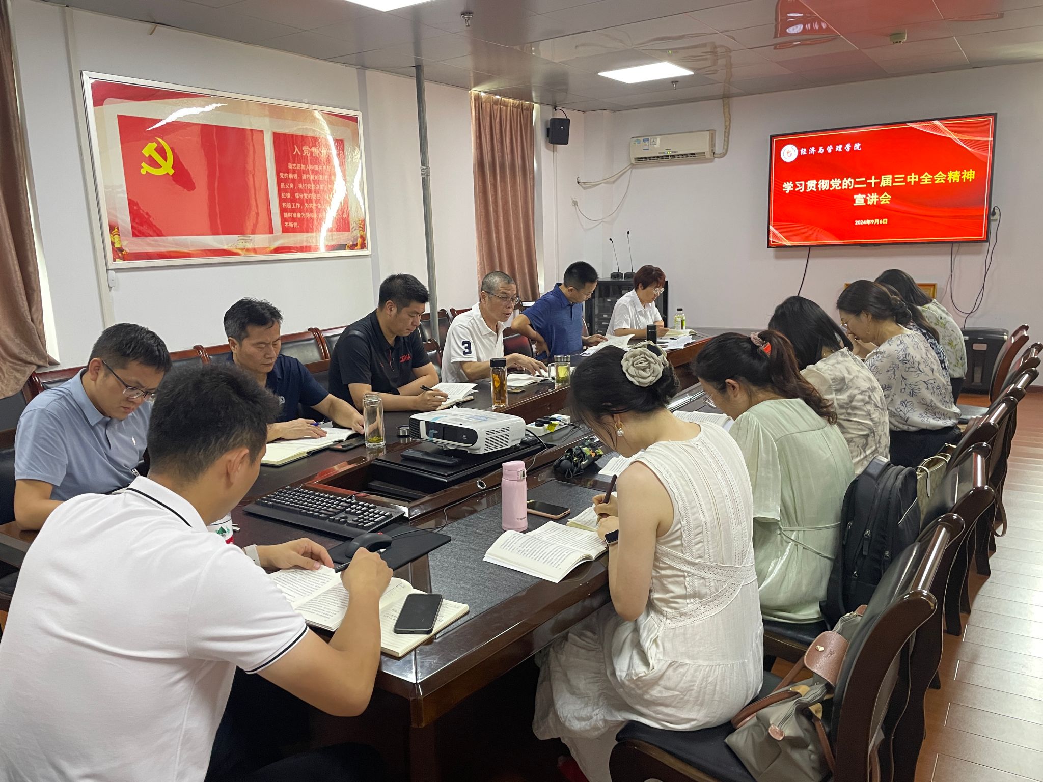 为进一步统一思想、凝聚共识,深入学习贯彻党的二十届三中全会精神,经济与管理学院院长王学实于9月6日下午在小球馆301会议室做党的二十届三中全会精神宣讲。宣讲会由学院副院长陈刚主持,学院党委书记胡彦侠、各教研室主任、党支部书记、专职教授代表、民主党派成员参加会议。