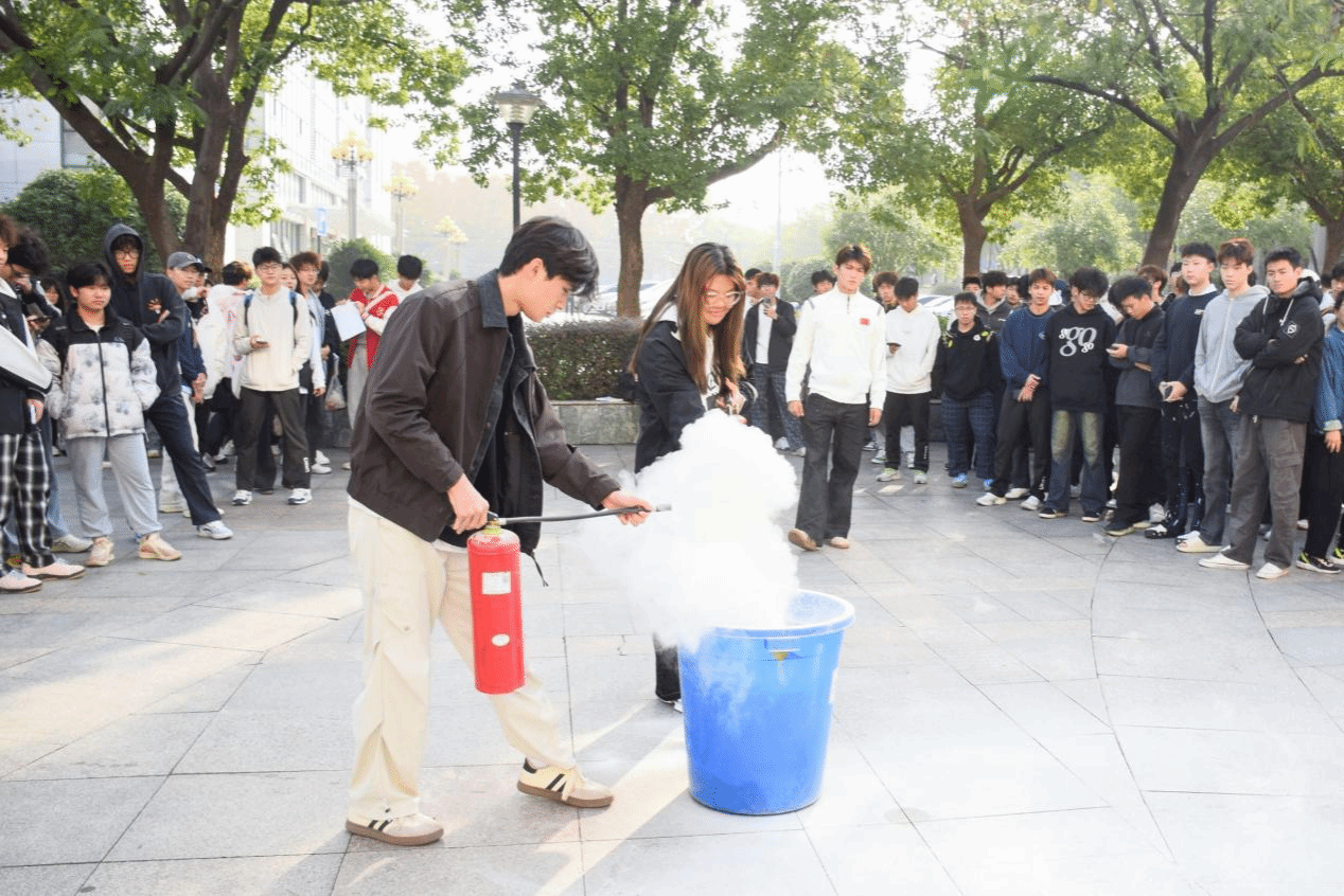 学院牵头组织全校师生开展实战化消防应急演练。演练前,工作人员明确演练流程、逃生路线及注意事项;演练中,随着模拟火灾警报声响起,各年级同学迅速弯腰低姿、用湿毛巾捂住口鼻,在宿管和疏导员的引导下,沿着预定路线快速有序撤离至奥星苑广场安全区域,全程紧张有序、规范高效。随后,工作人员现场演示灭火器“提、拔、握、压”使用步骤,组织师生分组实操演练,让大家亲手掌握灭火技能。